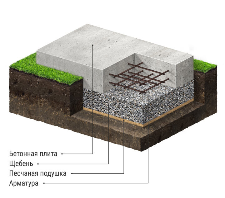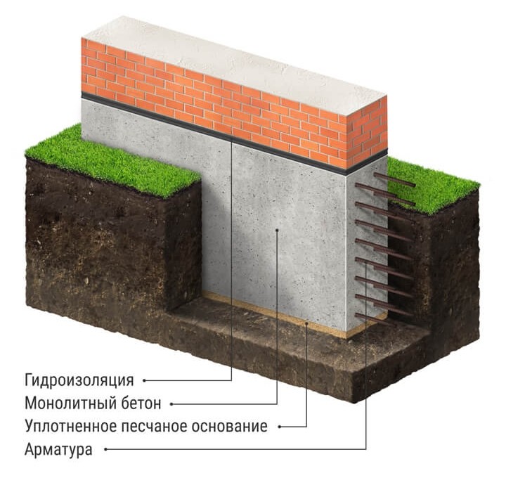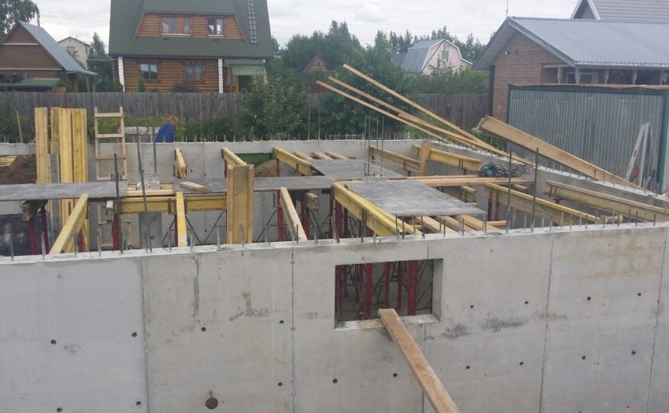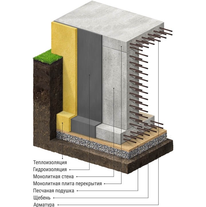Конструктивно фундамент дома с подвалом или цокольным этажом представляет собой заглубленную в грунт бетонную плиту, на которой возводятся стены с использованием монолитной или сборной технологии.