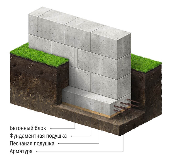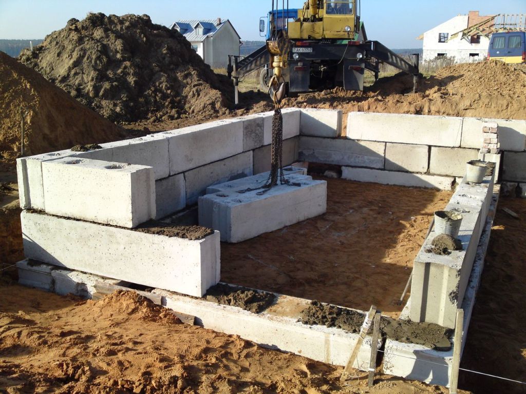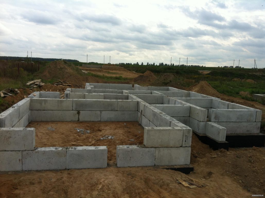 Этот вид основания является одним из самых популярных благодаря простоте технологии, скорости установки и стоимости. ФБС (фундаментные стеновые блоки) укладываются в подготовленный котлован и образуют опору здания.