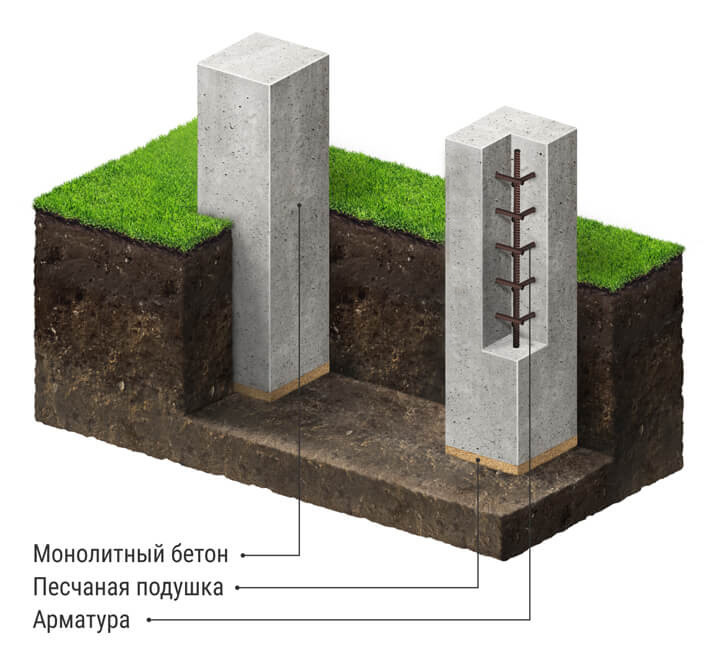 Столбчатый фундамент представляет собой систему опор, расположенных в местах сосредоточения нагрузки – в точках пересечения несущих стен и в углах здания. Строительство на столбах является оптимальным решением для каркасных домов из нетяжелых материалов.